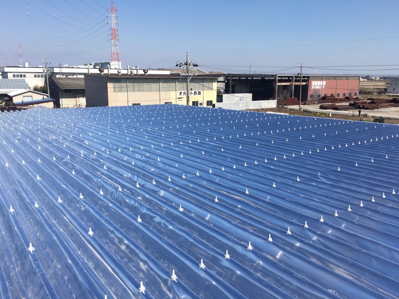 折板屋根の上に両面テープでシートを貼り付ける「スカイ工法」で施工します。高い固定力で風速40mでも耐えうる性能をもちながら大型倉庫・高天井にも対応できます。